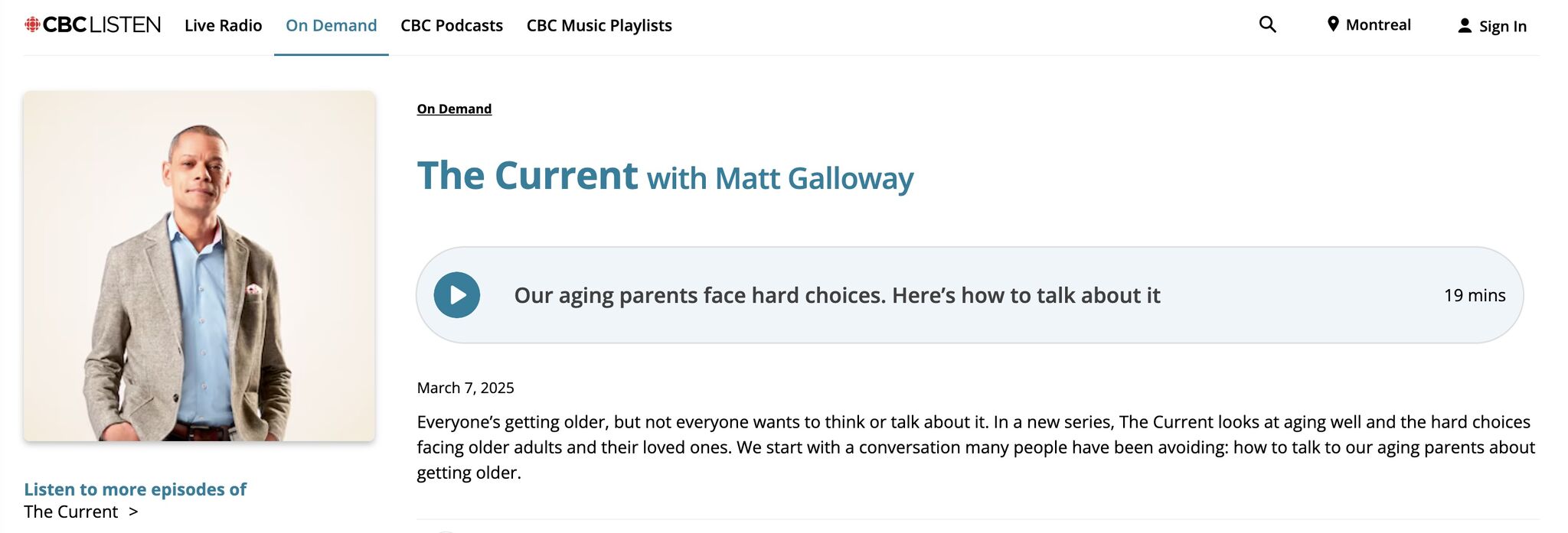 Talking to parents about aging is uncomfortable. There can be several elephants in the room all at once; admission that death may be around the corner, accusations of trying to stick them in a home or get their money, refusal to ‘listen to reason’ about diminishing capacities. The CBC’s ‘The Current‘ has recently come out with a great set of segments on aging.